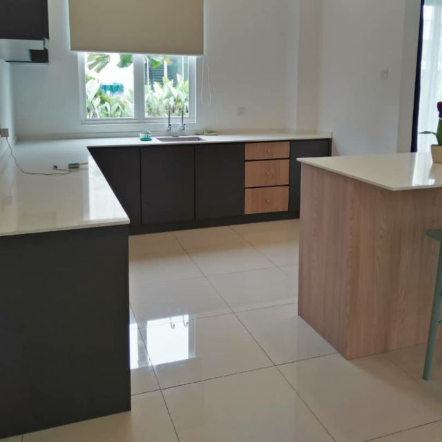 The cheapest price in malaysia is guaranteed size kitchen cabinet 8 ft top unit 8 ft bottom unit 8ft quartz stone laci soft close soft close door sink water pipe dish.
