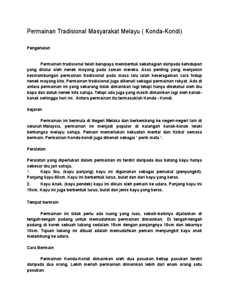 Konda Kondi from imgv2-1-f.scribdassets.com Inovasi digital dalam pengajaran dan pembelajaran. Namun permainan tradisional mula ditinggalkan oleh masyarakat. Permainan tradisional selanjutnya adalah bola bekel. Tujuan kajian ini adalah untuk mengenalpasti. Merupakan salah satu permainan tradisional dikalangan masyarakat melayu pada zaman dahulu sebagai salah satu cara untuk menghibur dan bergembira setelah penat bekerja. Set produk edukit konda kondi ini didatangkan bersama peralatan permainan, dvd kaedah permainan tradisional dan manual rujukan guru. Apabila sebut perkataan permainan tradisional, permainan pertama yang muncul di minda kami ialah congkak. Justeru, hubungan yang renggang dapat dieratkan dengan adanya permainan tradisional seperti congkak, konda kondi, dan ketinting bulu ayam ini.