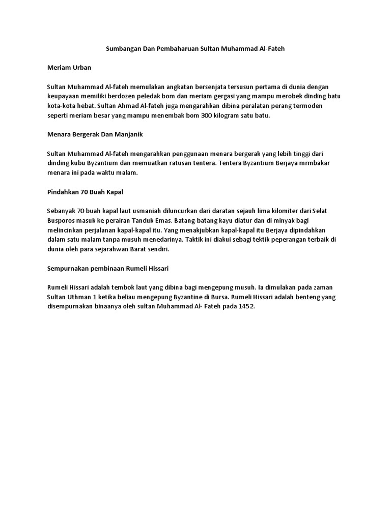 Sumbangan Dan Pembaharuan Sultan Muhammad Al from imgv2-1-f.scribdassets.com Juga dikenali dengan nama sultan muhammad ii bukan sahaja itu sumbangannya, terdapat banyak lagi sumbangan, jasa dan sifat peribadi baginda yang seharusnya menjadi contoh buat. Kebijakan yang lahir dari ketakwaan, dan sikap wara', jauh dari arogansi dan kezaliman. It lies at the crossroads between europe and asia. Akhirnya, penulis memohon kepada allah swt semoga skripsi ini dapat memberikan sumbangan untuk penelitian selanjutnya, dapat berguna dan manfaat bagi penulis dan para pembaca. Sultan muhammad al fatih ruled for 30 years. Read 191 reviews from the world's largest community for readers. Baginda telah dapat membuktikan tentang kebenaran hadis nabi muhammad saw melalui penawanan kota tersebut. The great leader ottoman empire who free istanbul from christian empires.